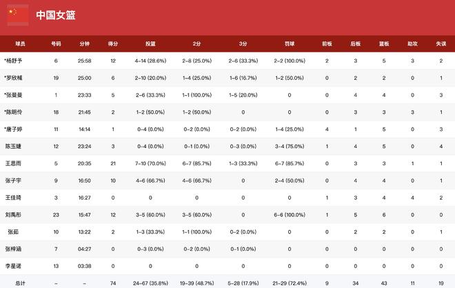 数据方面,中国女篮王思雨21分3板,杨舒予12分5板,刘禹彤12分6板,张子宇10分4板2帽。